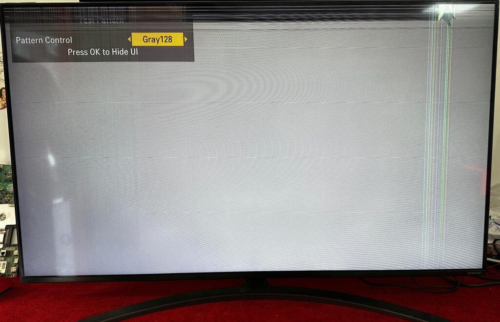 LG 49NANO866NA model televizyonlarda görülen bu arızada ekranda dikey çizgiler, yatay bantlar, renk bozulmaları veya görüntünün bir bölümünde tamamen kayıp oluşur. Servis menüsünde test (pattern) görüntüleri verildiğinde çizgilerin kaybolmaması, arızanın panel (TFT) kaynaklı olduğunu net şekilde gösterir.